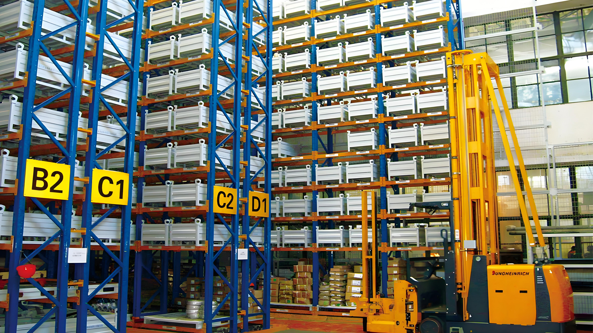 VNA is an adaptation of standard adjustable pallet racking systems, but compacted into a very small area.it can be reduced by up to 1.5 metres in width and save up to 40% in space.